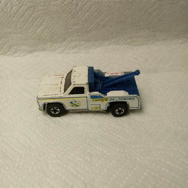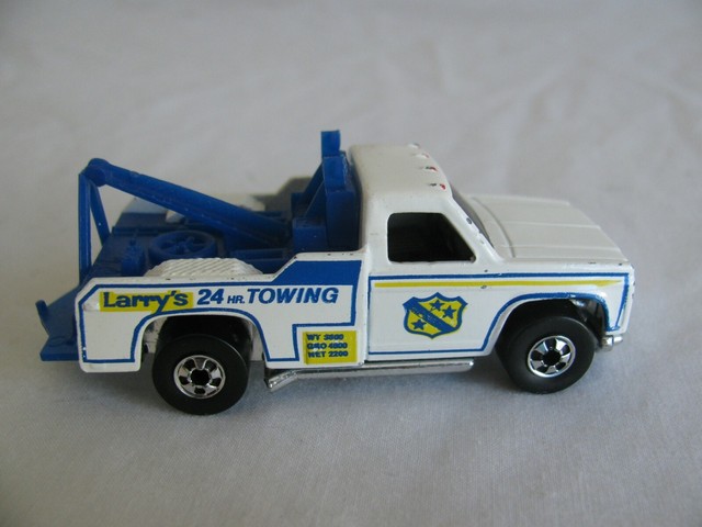 Hot wheels larrys 24 hr towing redline tow truck, a lot of the decal has worn off and the paint is worn and part of the tow is gone, but it still looks good and the tires are all there and they roll.