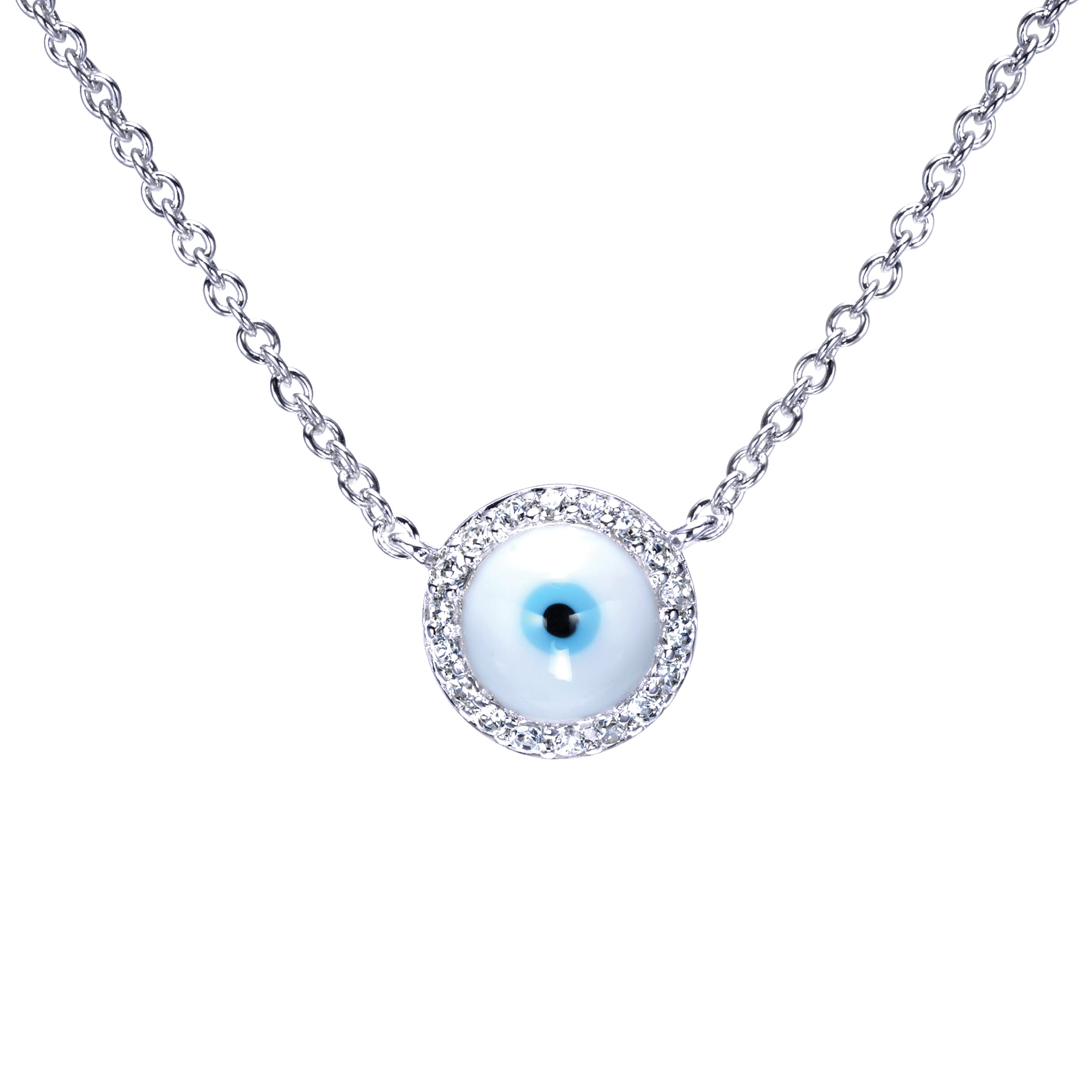 14k white gold azure blue evil eye diamond necklace.